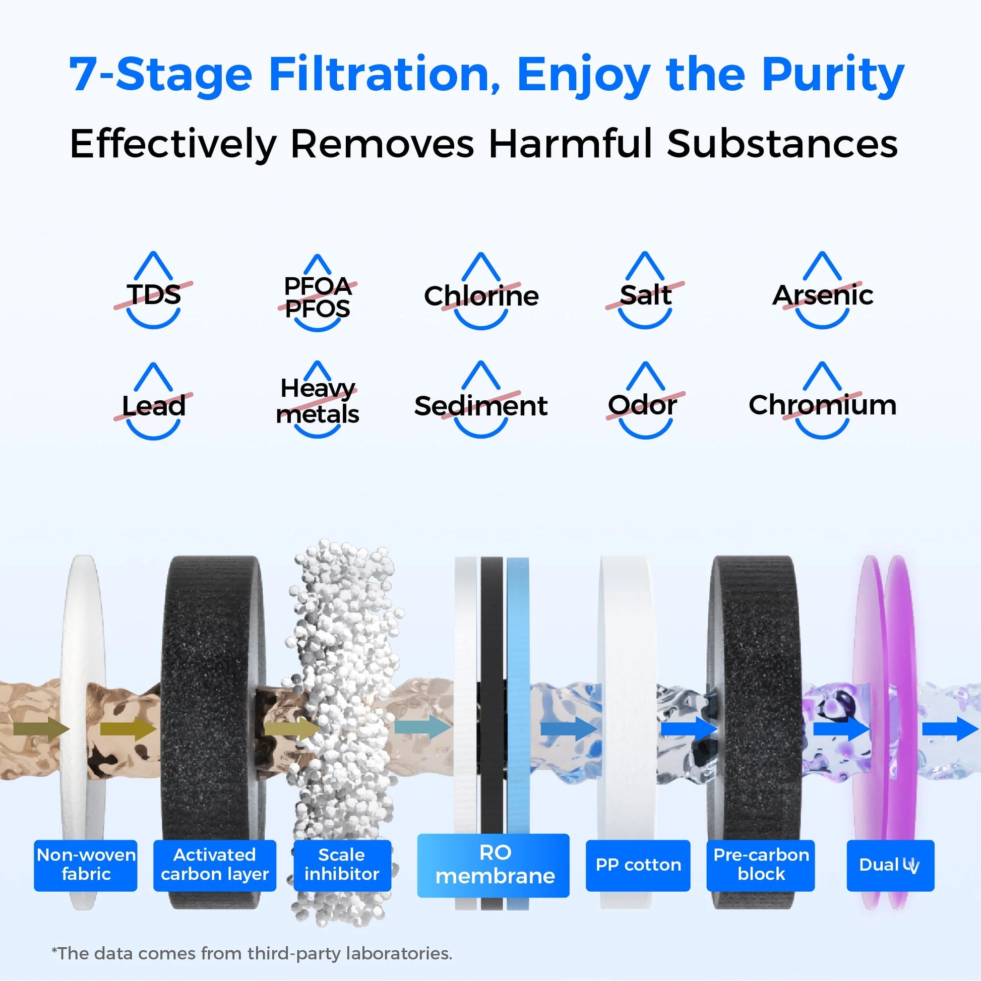 This water purification system features 0.0001μm ro membrane to reduce TDS, PFOA, PFOS, Chlorine, Salt, Sediment, Lead, Odor, and more in your tap water.